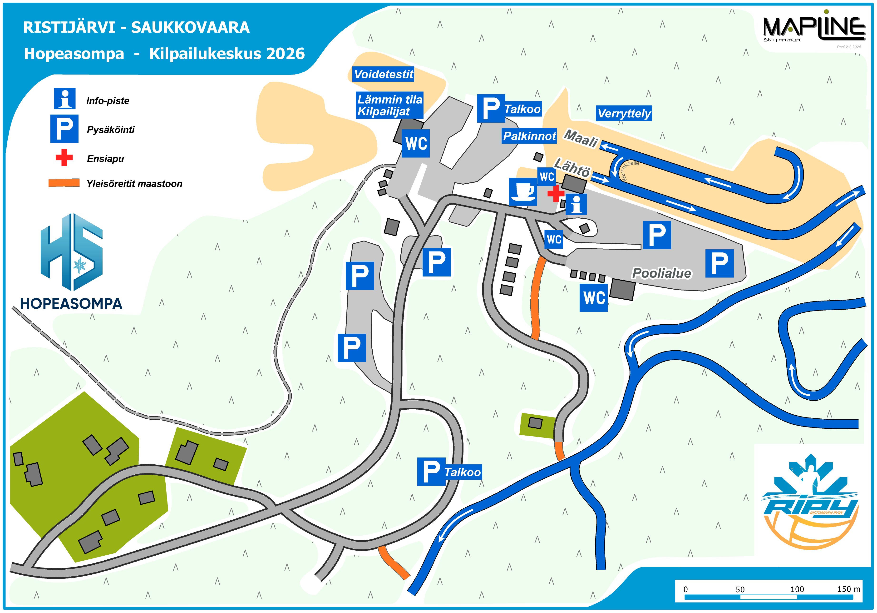 Kilpailukanslia toimii kirkonkylän taajamassa. Infoteltta on kisojen stadionalueella ks. aluekarttalinkki